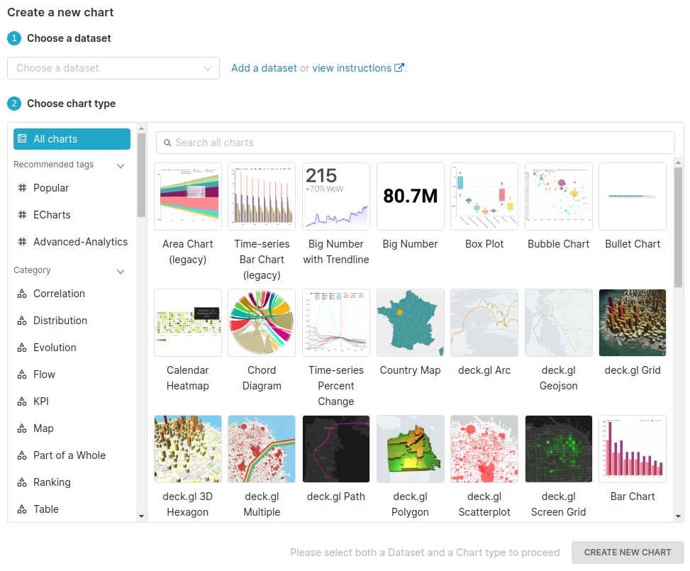 Lo primero que corresponde hacer, es crear un chart o gráfico. Superset incluye una serie de opciones: