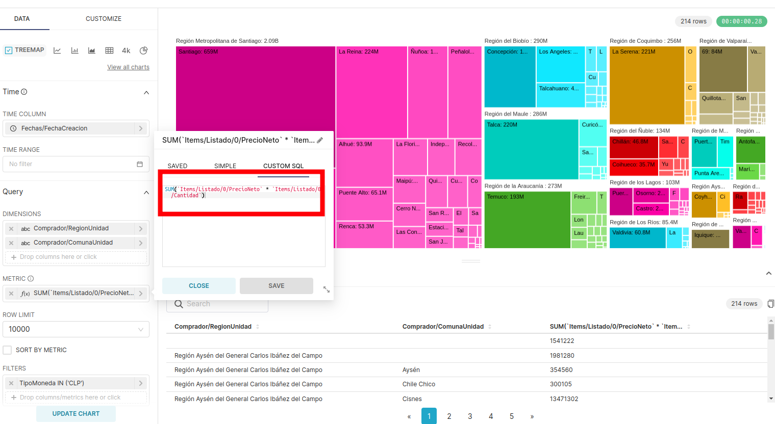 Así problemas un gráfico del tipo "treemap". Como métrica sumamos el Monto Neto de las Ordenes de Compra y las agrupamos por "Region >> Comuna". Así nos generó este lindo gráfico: