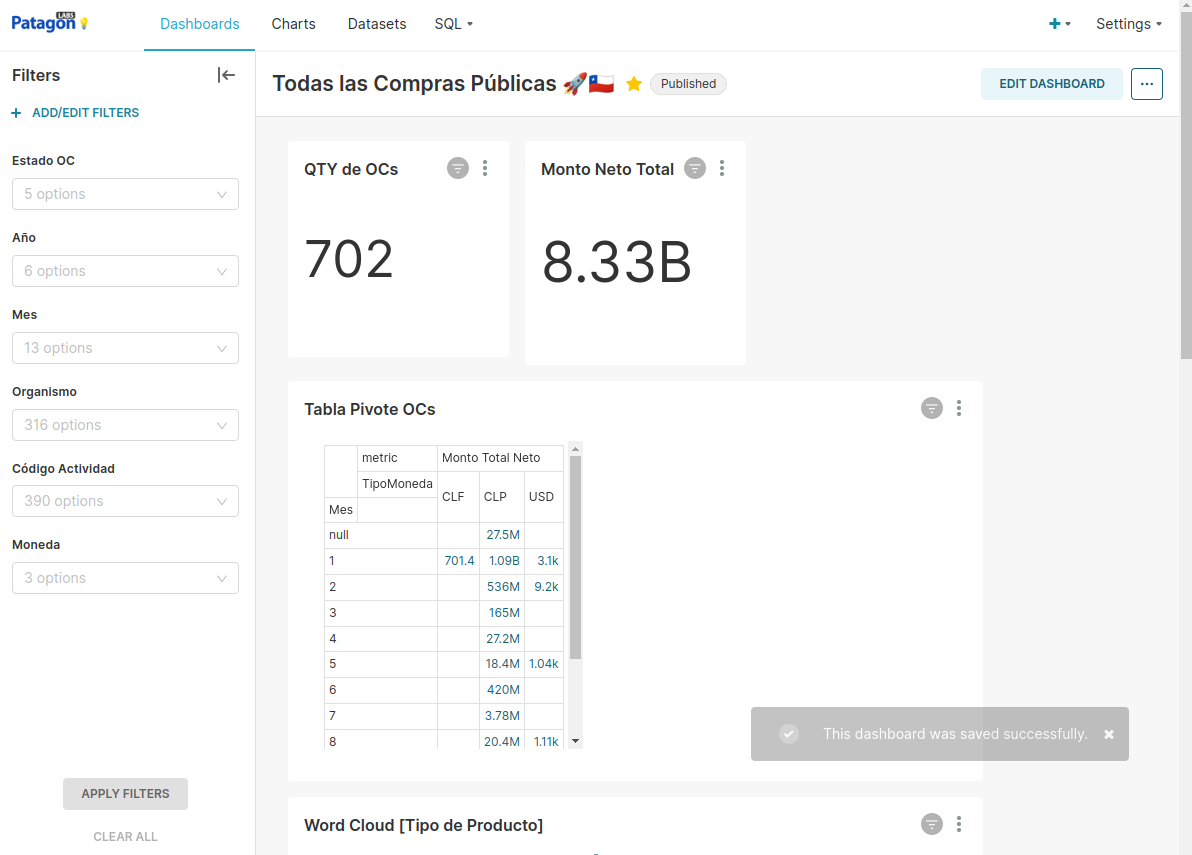 Finalmente los dashboard son un conjunto de Charts o gráfico. Lo bueno es que es posible agregar filtros y estructurarlo con puros "drag & drop":