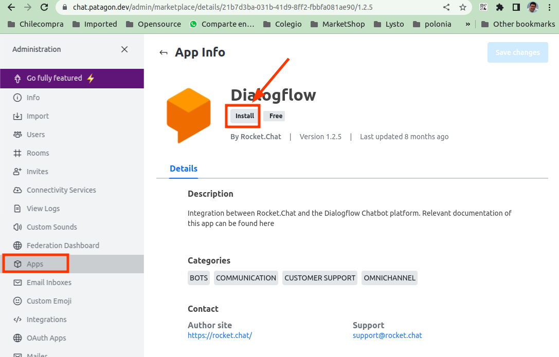 Una vez instalado Rocket.Chat, se debe habilitar la aplicación de DialogFlow: