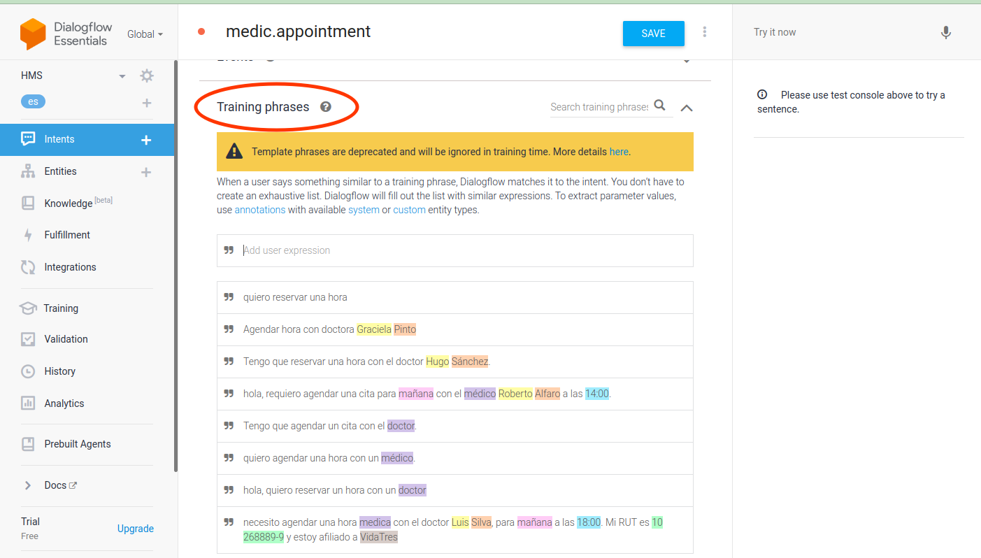 Se usan las frases de entrenamiento para ir declarando el hilo de la conversión que administrará dicha intención. Así, se puede ir creando un flujo (o árbol) de conversación.