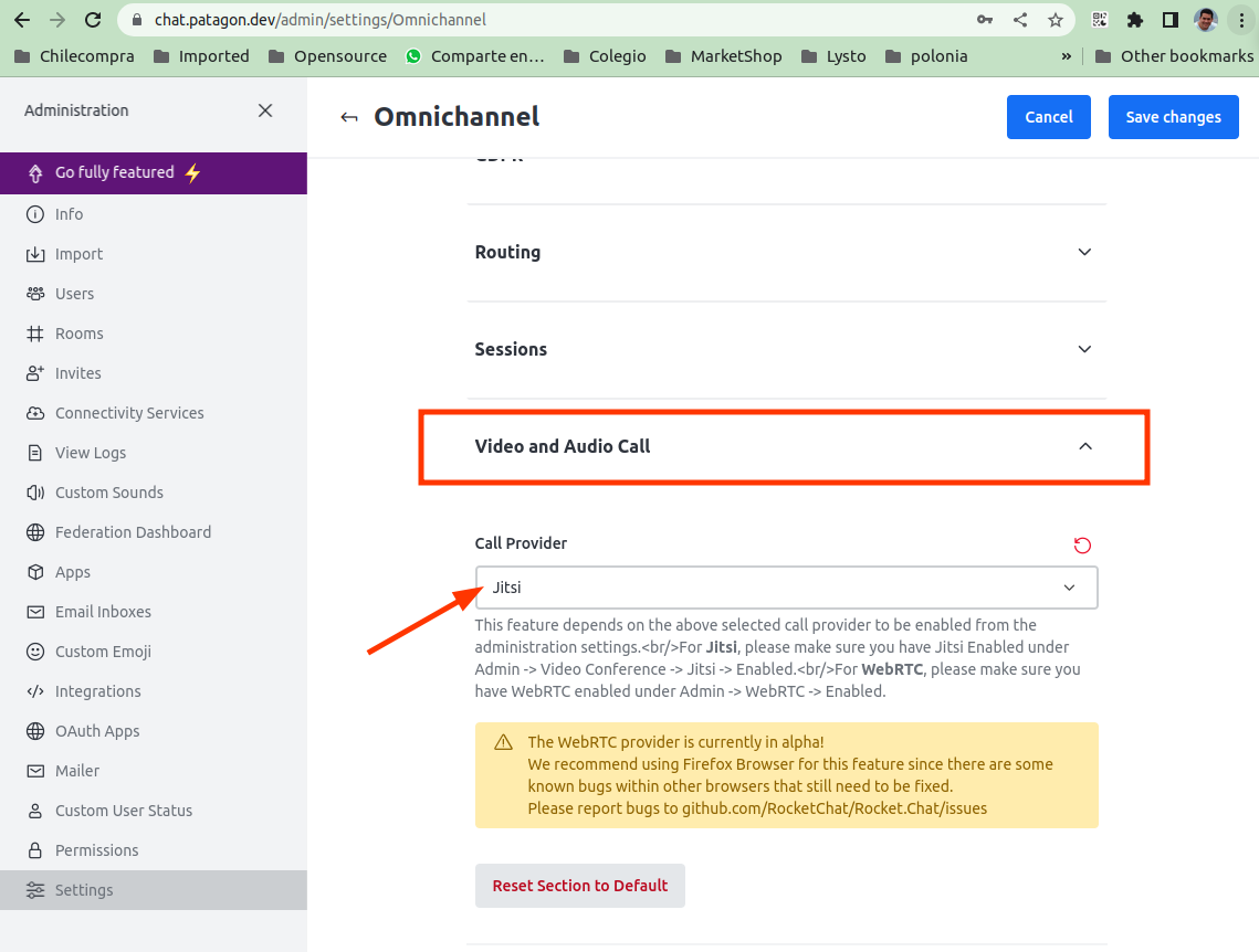 Jitsi se puede integrar con un sinfín de aplicaciones. Entre ellas está RocketChat, una plataforma de mensajería de código libre. Con RocketChat y Jisti, puedes hacer video llamadas desde el Chat. Sólo debes habilitar la opción de video en tu instalación de RocketChat: