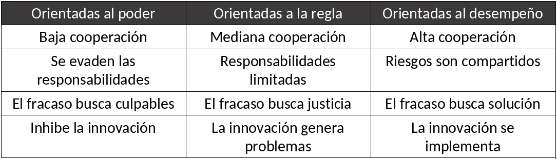 Existen muchos estudios respecto de los distintos tipos de culturas empresariales, pero aquí utilizaremos el del psicólogo Ron Westrum. Si bien su estudio de cultura organizacional (1998) estaba enfocado en el contexto de accidentes y sus riesgos, ésto se realizaron principalmente en empresas tecnológicas de industrias como la aviación y la salud. Westrum definió 3 clases de empresas: