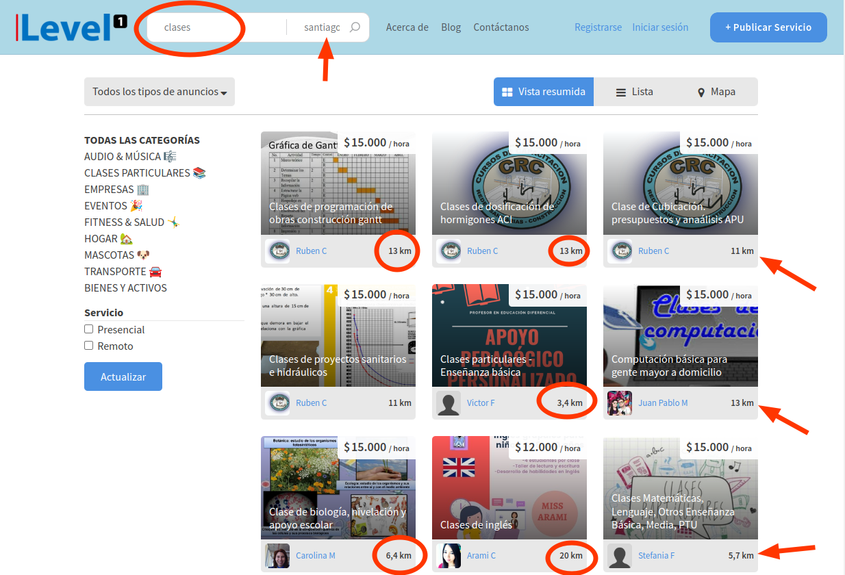 Y así, cuando otro usuario hace una búsqueda con referencia a alguna zona, el resultado de respuesta despliega los servicios con la distancia: