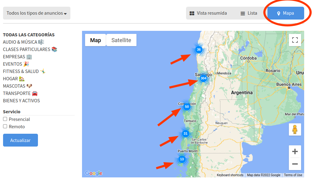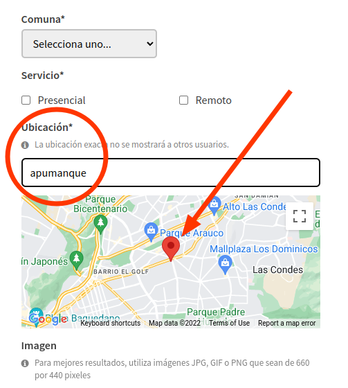 Como decíamos, uno de los requerimientos fue que cada publicación tuviese Georeferenciación. Por lo mismo, cuando un usuario publica un nuevo anuncio, se le solicita la dirección o punto de referencia. En este ejemplo, sólo escribí "apumanque" e inmediatamente el mapa reconoció la ubicación: