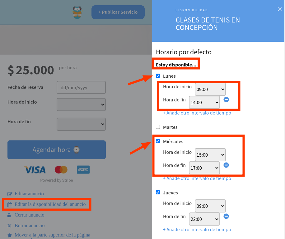Y así el comprador, al momento de comprar una hora de servicio, sólo podrá hacerlo agendando una hora según la disponibilidad del servicio (horario disponible del vendedor, menos las horas reservadas por otros compradores). Luego, un comprador, verá la publicación así: